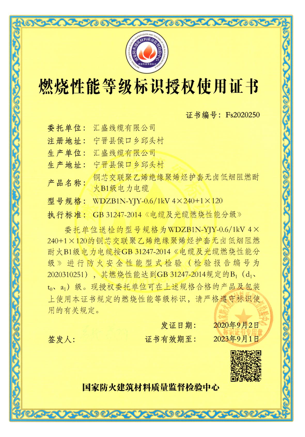 燃燒性能等級標(biāo)識授權(quán)使用證書